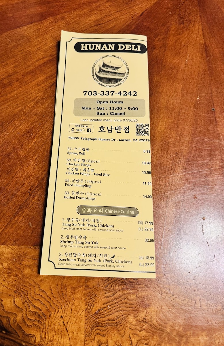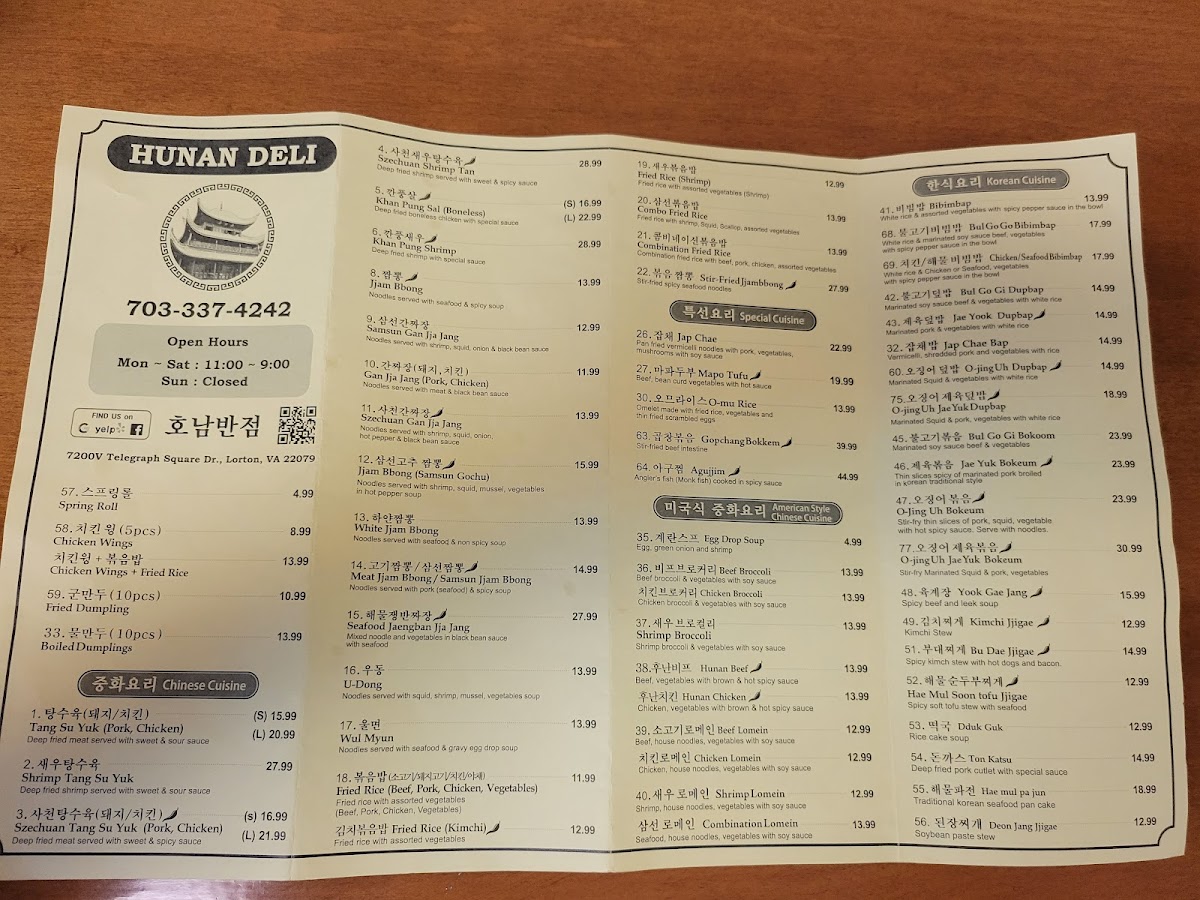 The menu at Hunan Deli Korean & Chinese Restaurant features a diverse selection of dishes spanning Korean, Chinese, and American-style Chinese cuisines. It is organized into several key groups that cater to different tastes and meal preferences.