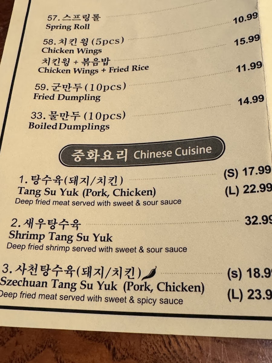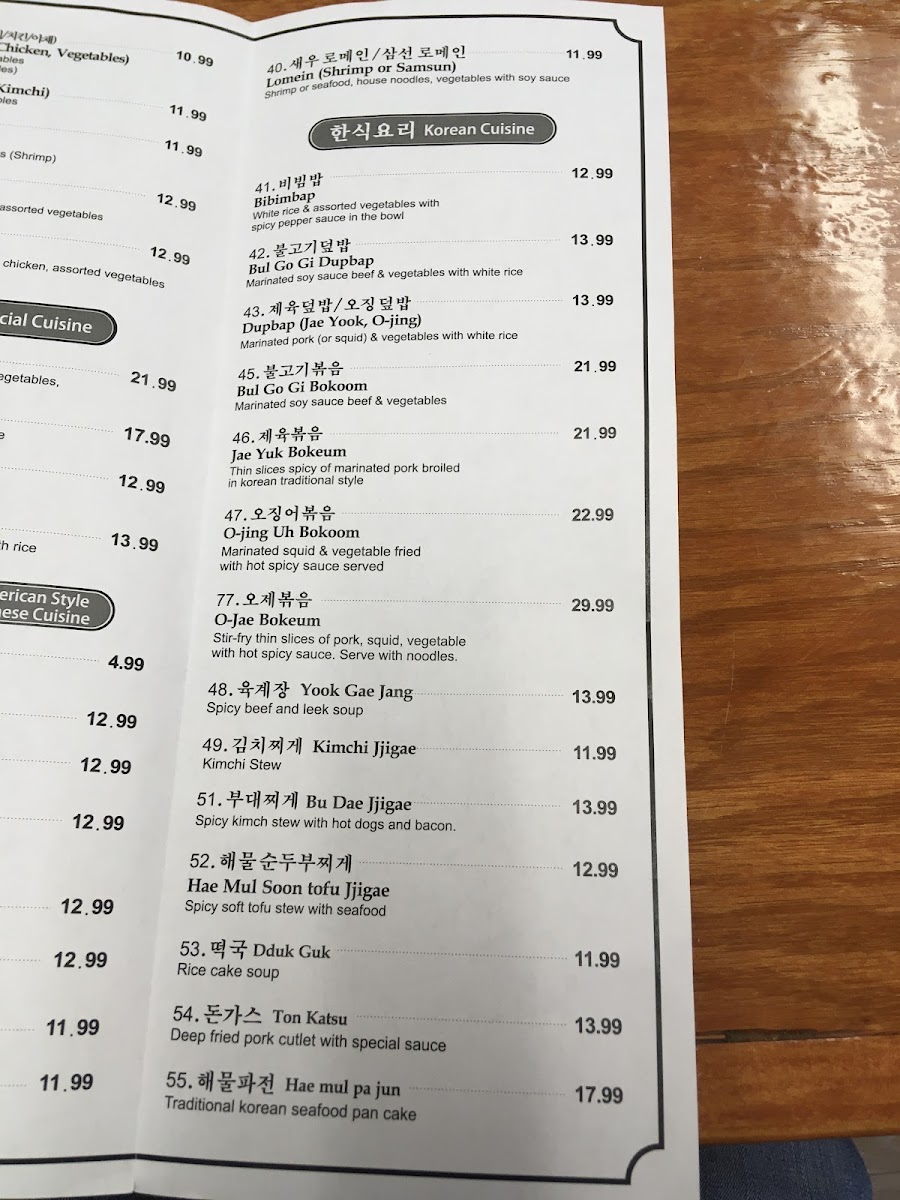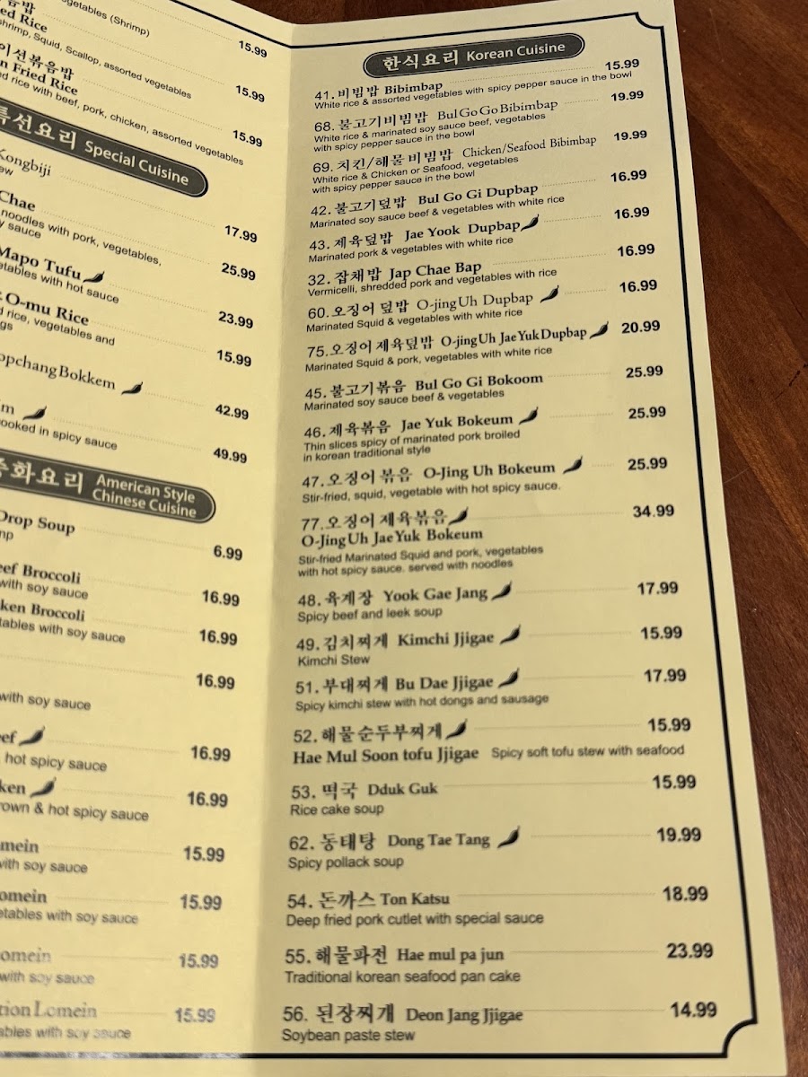 The menu is suitable for casual dining occasions, offering options for both quick orders and more extensive meals. Patrons can expect authentic flavors across Korean and Chinese specialties, with dishes that accommodate a range of appetites from light snacks to full entrees.